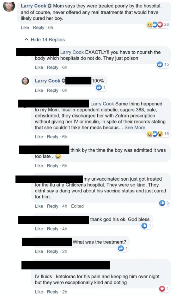 “Mom says they were treated poorly by the hospital, and of course, never offered any real treatments that would have likely cured her boy,”