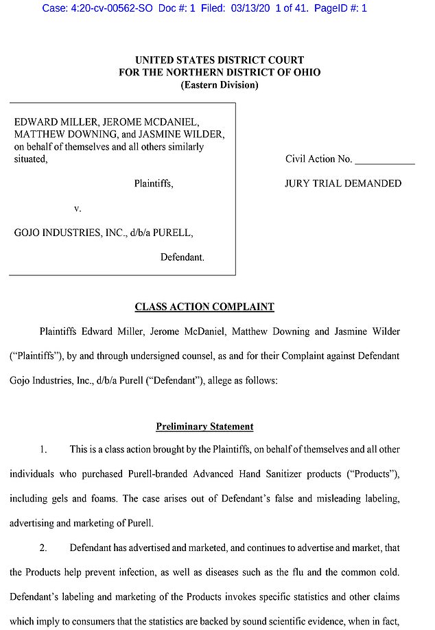 In addition, the suit states, “The Warning Letter specifically noted that additional representations Defendant had made about the Products’ effectiveness against the flu, norovirus, and ebola were unsubstantiated insofar as the FDA was not aware of any study showing that killing bacteria or virus on skin reduced the likelihood of infection or disease in users.”