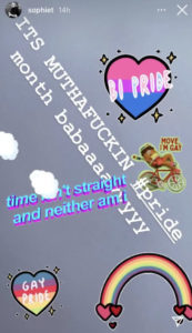 She then added, “Time isn’t straight and neither am I.” Other gifs said, “Bi pride,” “Gay pride” and “Move, I’m gay.”