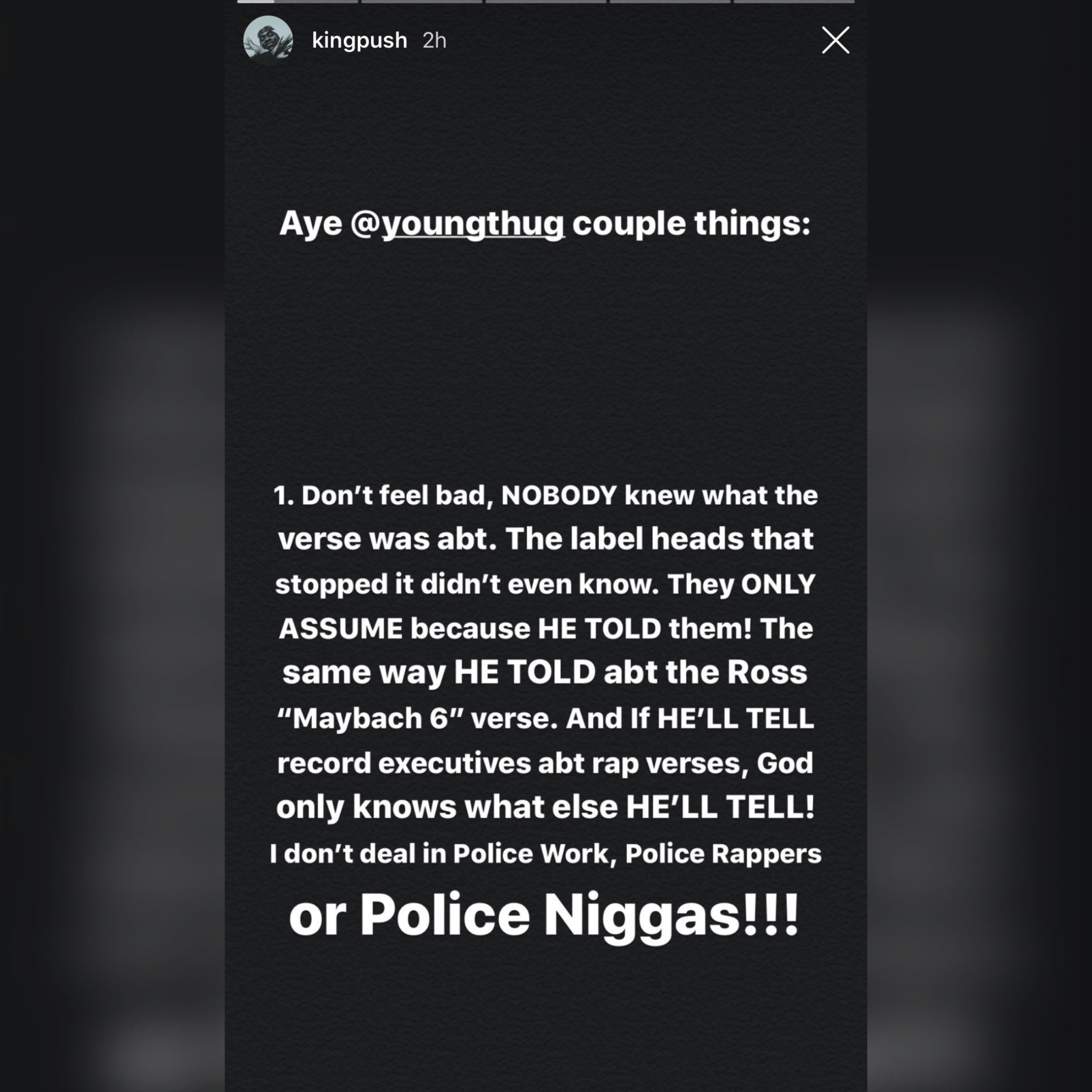 Following Thug’s statement, Pusha also hopped on Instagram to directly respond to him: “Aye @youngthug couple things: 1. Don’t feel bad, NOBODY knew what the verse was abt. The label heads that stopped it didn’t even know. They only ASSUME because HE TOLD them! The same way HE TOLD abt the Ross ‘Maybach 6’ verse,” said Push, suggesting that Drake is a snitch. “And if HE’LL TELL record executives abt rap verses, God only knows what else HE’LL TELL! I don’t deal in Police Work, Police Rappers, or Police N***as.”